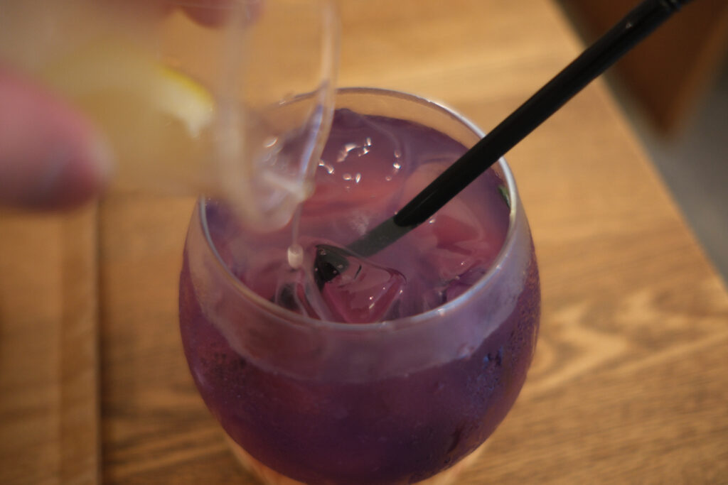 レモン汁を入れると赤色に変わるんだって。すごーい!