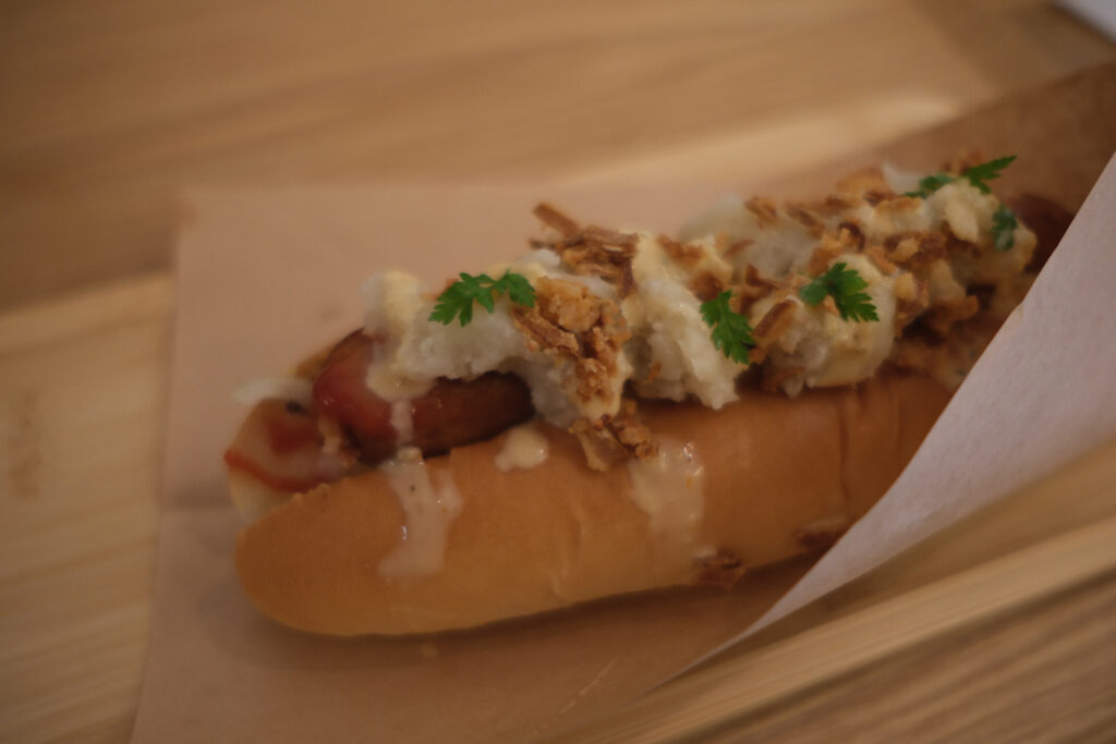 なんとなんと、ホットドッグの上にポテトとガーリックチップが乗っていて最高&最高!